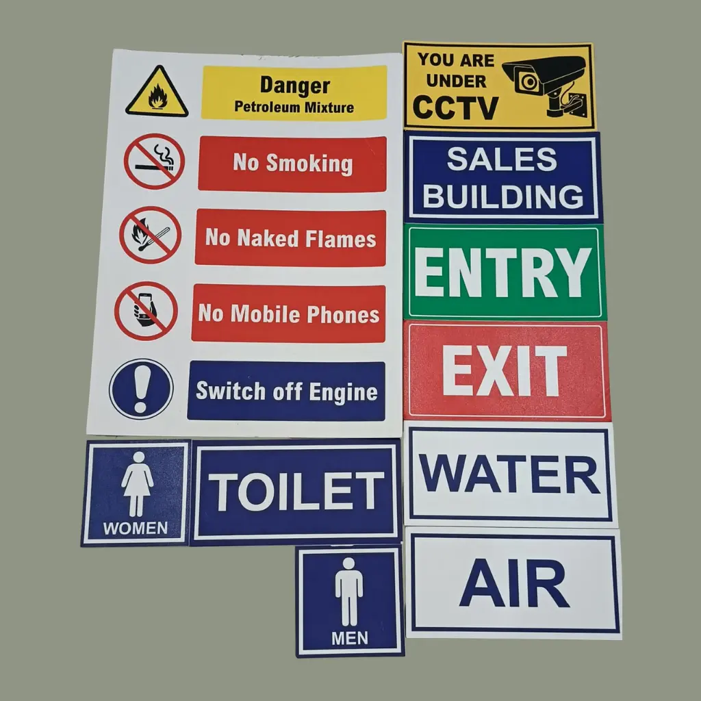 Durable and weatherproof sign boards for petrol pumps. Includes safety signs, branding boards, and display signage for fuel stations. Customizable as per oil company norms.
